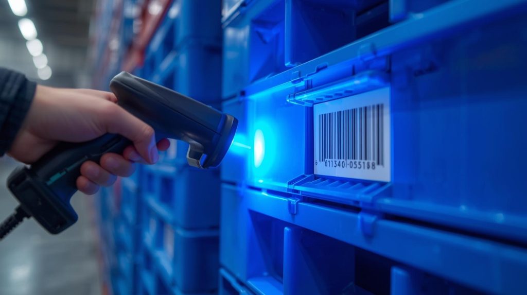 Ilustrasi gambar scanning barcode pallet plastik biru
