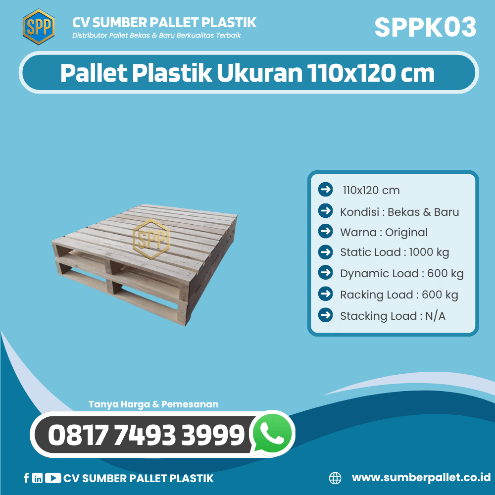 Dalam dunia logistik dan pergudangan, penggunaan pallet sudah menjadi kebutuhan utama. Pallet berfungsi sebagai alas yang memudahkan proses penyimpanan, penataan, maupun distribusi barang. Salah satu produk andalan dari CV SUMBER PALLET PLASTIK adalah Pallet Kayu Bekas/Baru Ukuran 110×120 cm – SPPK03. Produk ini hadir untuk memberikan solusi praktis dan ekonomis bagi pelaku usaha di berbagai sektor, mulai dari manufaktur, retail, hingga distribusi ekspor.