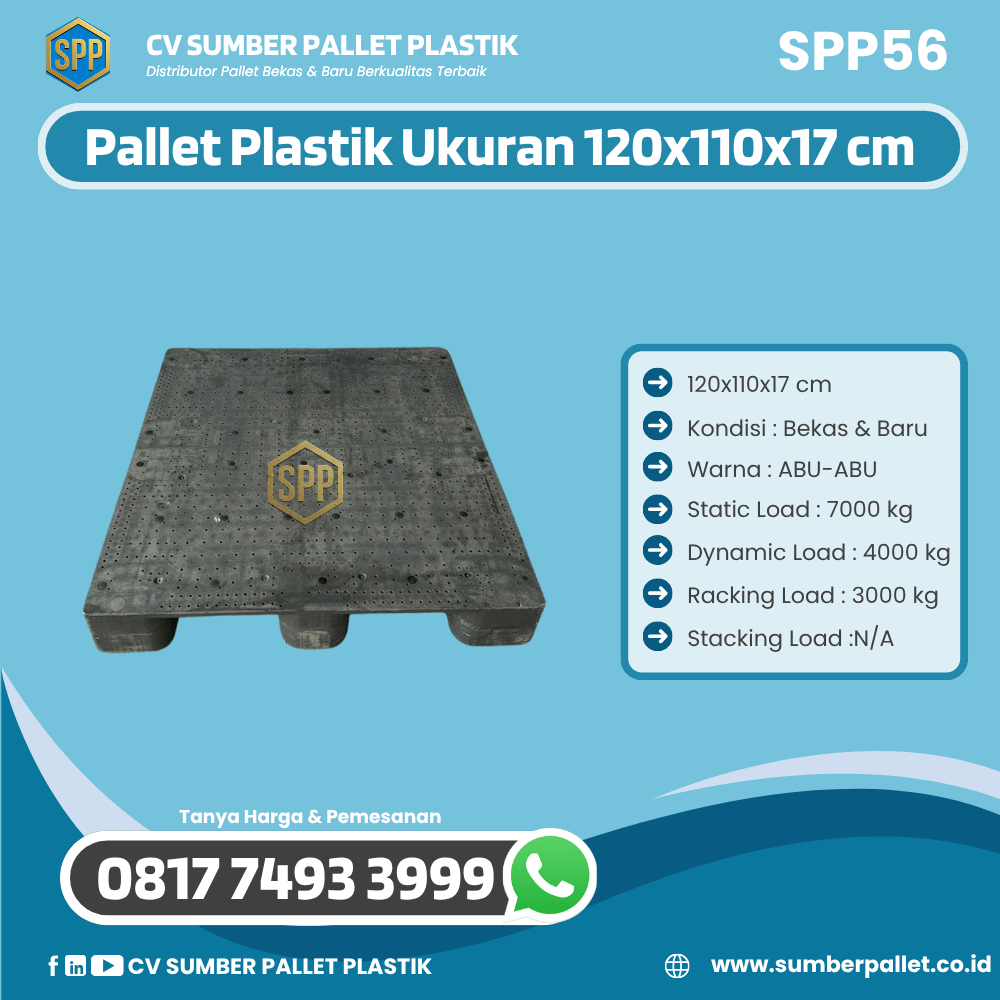 CV SUMBER PALLET PLASTIK merupakan perusahaan terpercaya yang bergerak di bidang penjualan pallet plastik baru maupun bekas. Kami menghadirkan berbagai pilihan pallet dengan kualitas terbaik, pelayanan profesional, serta harga yang terjangkau untuk mendukung kebutuhan industri, gudang, maupun distribusi barang. Salah satu produk unggulan kami adalah Pallet Plastik Bekas/Baru Ukuran 120x110x17 cm – SPP56, yang dirancang untuk memenuhi standar operasional modern dengan daya tahan tinggi serta fleksibilitas penggunaan.